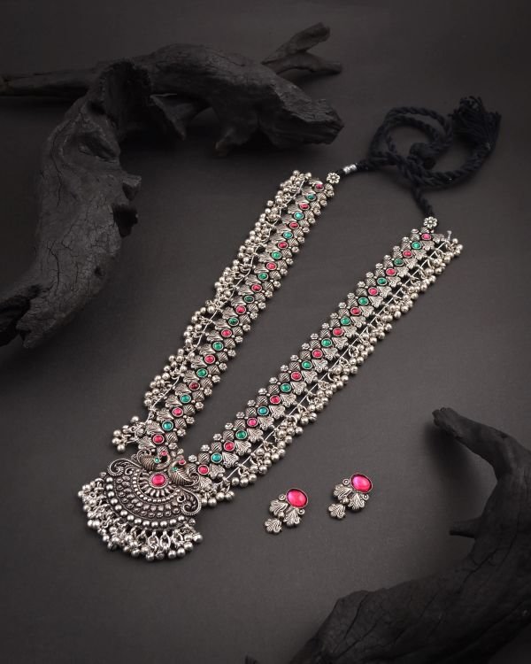 TheĀ The Oxidized Saaz is a traditional and stunning piece of jewellery that originates from the South Saaz is usually crafted with intricate patterns, including elements of traditional motifs like paisleys, floral designs, and geometric shapes. Sometimes, it can also feature religious or cultural symbols, such as peacocks or gods and goddesses, depending on the craftsmanship.