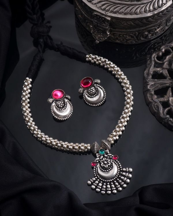 Embrace the timeless elegance of traditional Maharashtrian craftsmanship with the South India Oxidized Thushi Necklace. Known for its intricate design and cultural significance, this necklace beautifully showcases the heritage of South India. Made with high-quality Oxidized metal, it exudes a vintage charm that complements both contemporary and classic styles.