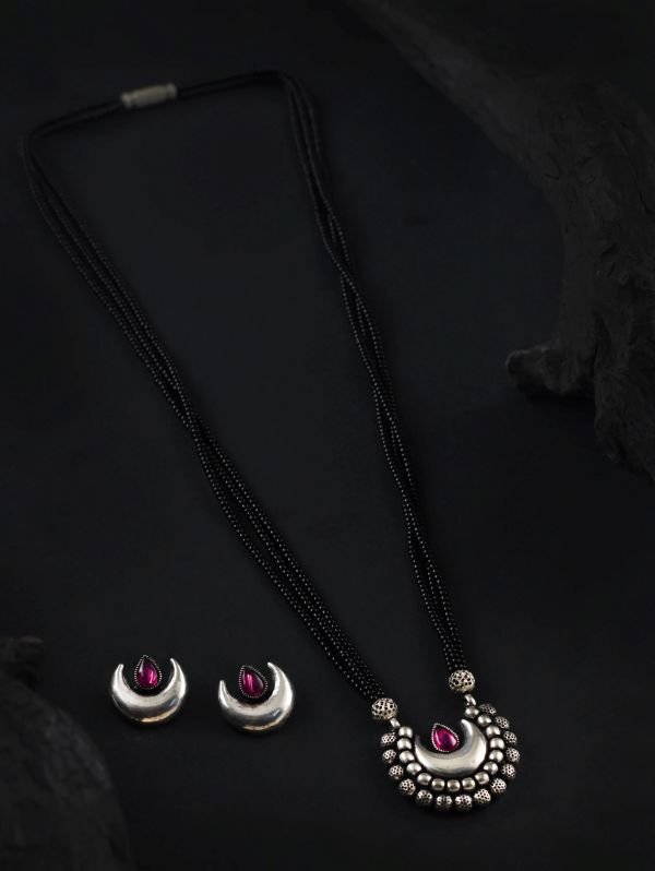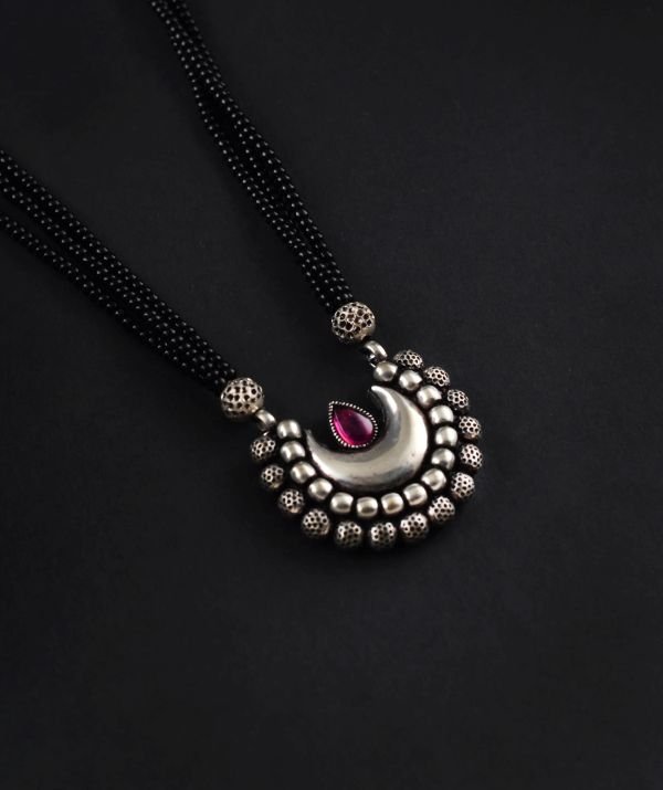 Embrace timeless tradition with a touch of modern elegance with thisĀ Oxidised Chand Mangalsutra. Crafted with intricate detailing and finished in classic black beads paired with oxidised silver charm, this piece beautifully blends heritage with contemporary style.