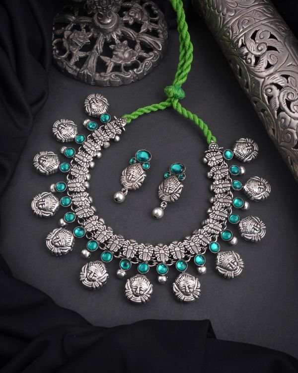 Be the first to review “Oxidised Durga Green stone Temple Necklace”