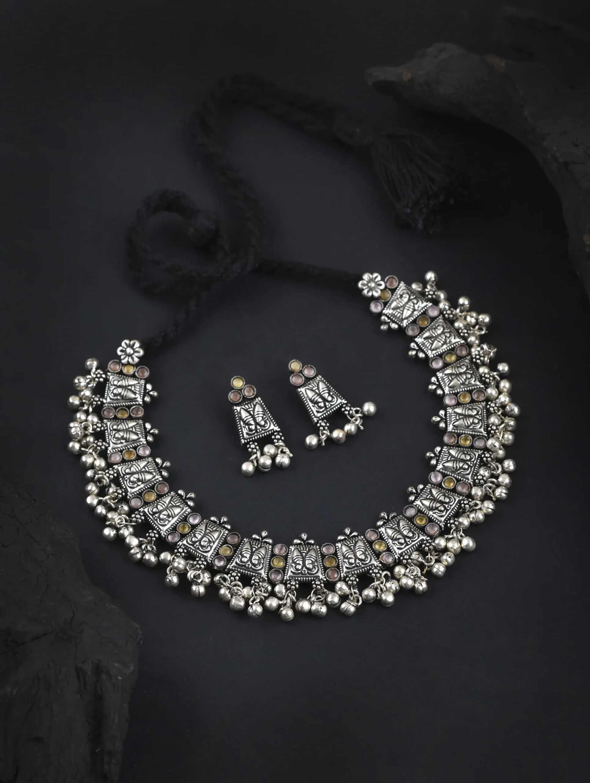 Add vibrant traditional charm to your jewellery collection with this stunningĀ Oxidised Peacock Ghungroo Stone Necklace. Designed with an elegant peacock motif, this necklace is adorned with beautifulĀ yellow and pink stonesĀ and finished with delicateĀ ghungroo accentsĀ that add graceful movement and a festive touch. The antique oxidised silver finish enhances its ethnic appeal, making it a perfect statement piece for weddings, festivals, and cultural celebrations. Pair it effortlessly with sarees, lehengas, or traditional outfits for a striking ethnic look.