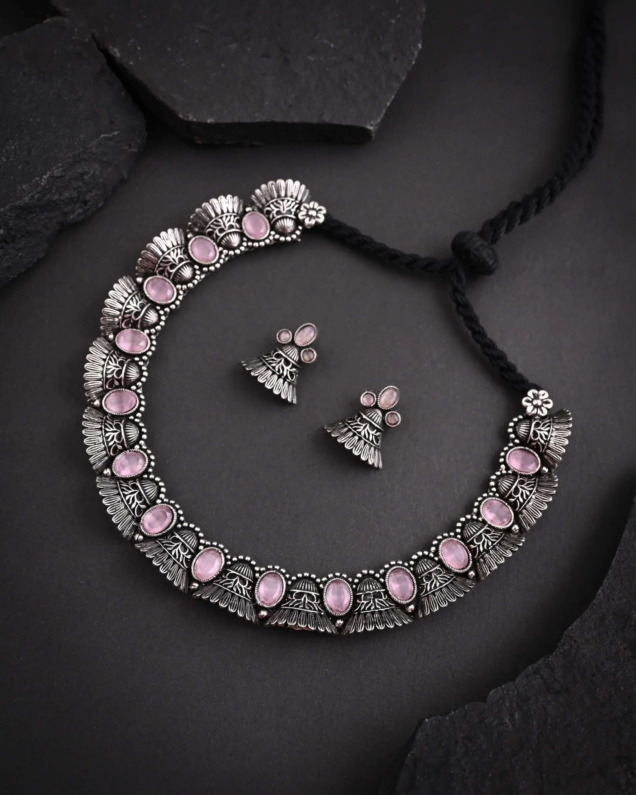 Oxidised Pink Monalisa Stone Necklace set