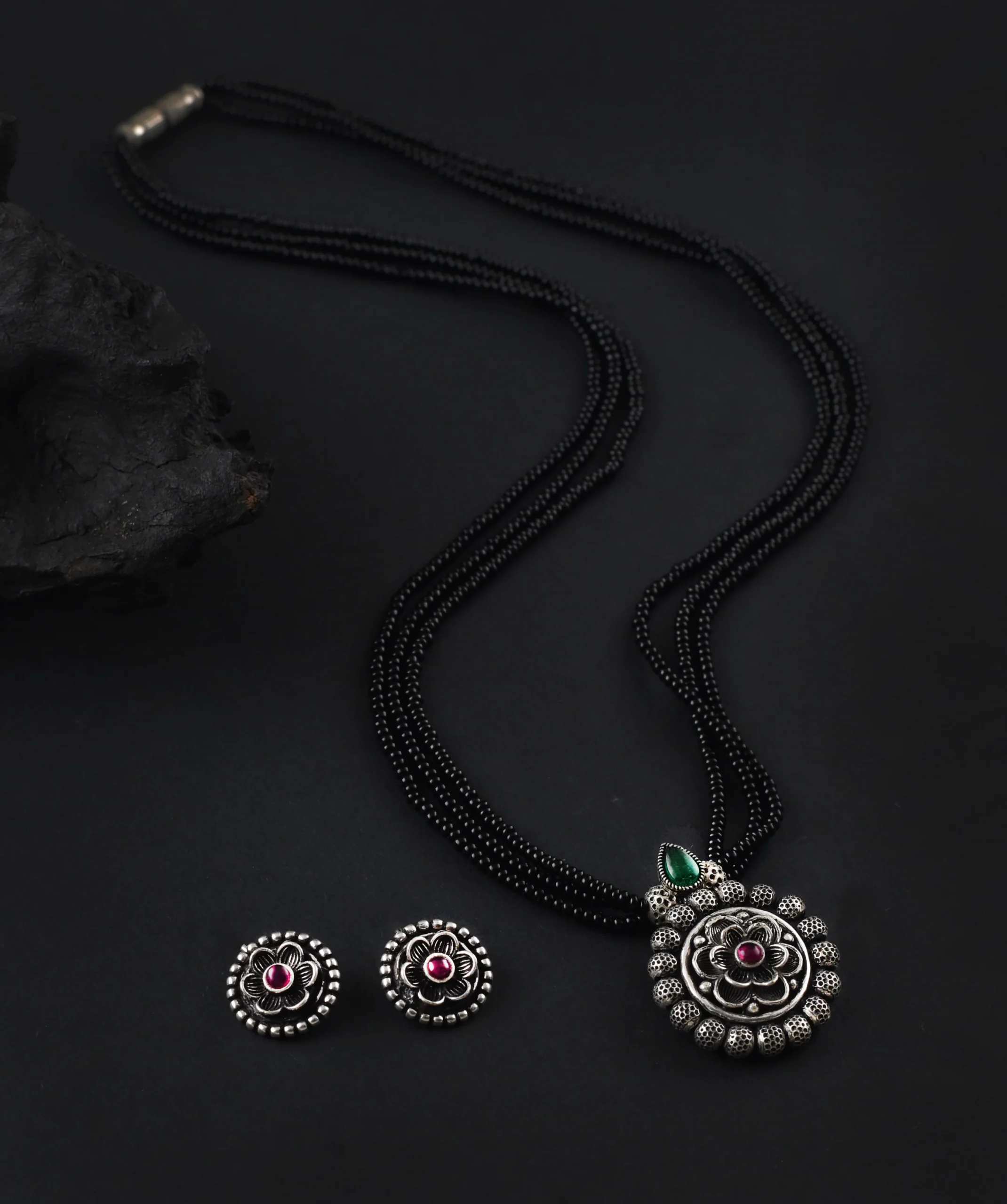 Embrace timeless tradition with a touch of modern elegance with thisĀ Oxidised Mangalsutra. Crafted with intricate detailing and finished in classic black beads paired with oxidised silver charm, this piece beautifully blends heritage with contemporary style.