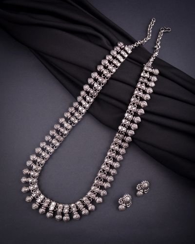 Embrace the elegance of tradition with this stunning Oxidised Temple Long Necklace. Crafted with intricate detailing, this statement piece showcases the artistry of temple jewellery.