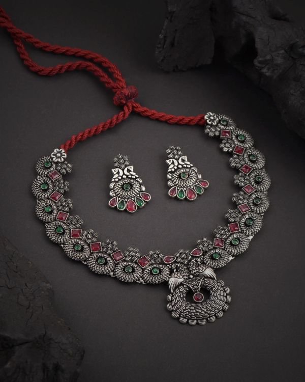 Elevate your ethnic collection with this stunning Oxidized Temple Necklace, a beautiful fusion of traditional artistry and modern elegance. Crafted with intricate detailing, the necklace features a timeless temple design with vibrant accents and exquisite craftsmanship. The oxidized finish gives it an antique charm, adding depth and richness to its appearance.