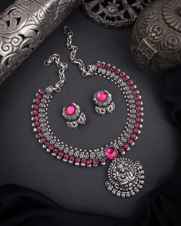 Elevate your ethnic collection with this stunning Oxidized Temple Necklace, a beautiful fusion of traditional artistry and modern elegance. Crafted with intricate detailing, the necklace features a timeless temple design with vibrant accents and exquisite craftsmanship. The oxidized finish gives it an antique charm, adding depth and richness to its appearance.