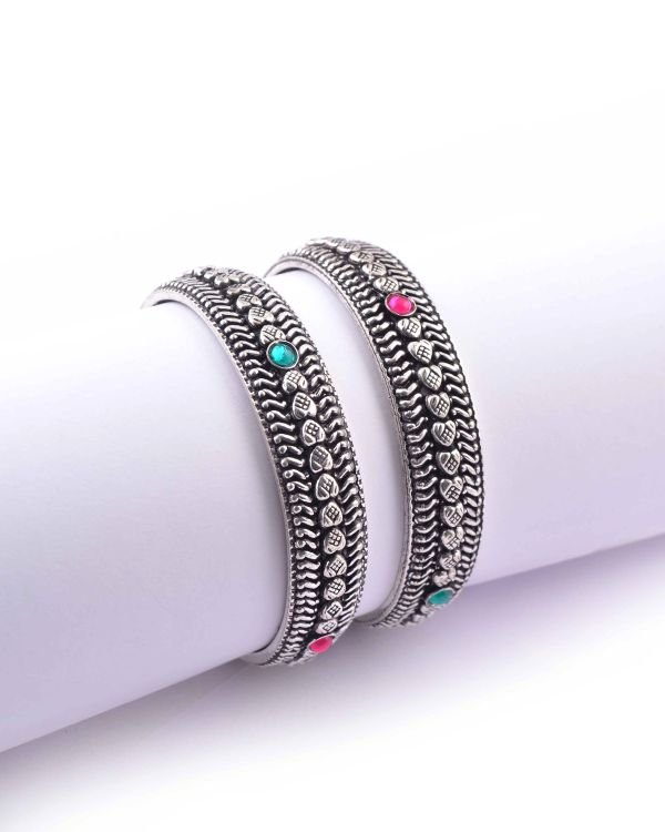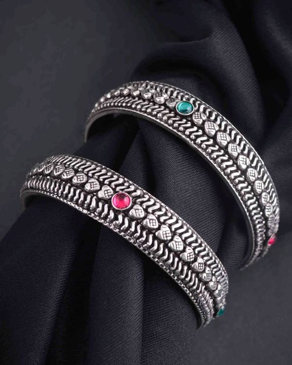 Oxidized Heart Motive BanglesĀ are stylishĀ ethnic banglesĀ featuring aĀ heart-shaped motifĀ as the main design element, finished in anĀ oxidized (antique metal) lookĀ thatās popular in Indian tribal and contemporary fusion jewelry.