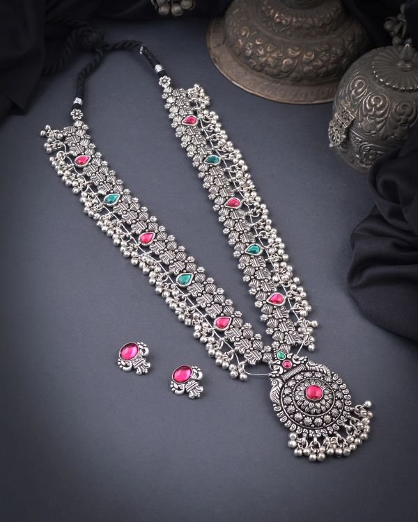 TheĀ The Oxidized Saaz is a traditional and stunning piece of jewellery that originates from the South Saaz is usually crafted with intricate patterns, including elements of traditional motifs like paisleys, floral designs, and geometric shapes. Sometimes, it can also feature religious or cultural symbols, such as peacocks or gods and goddesses, depending on the craftsmanship.