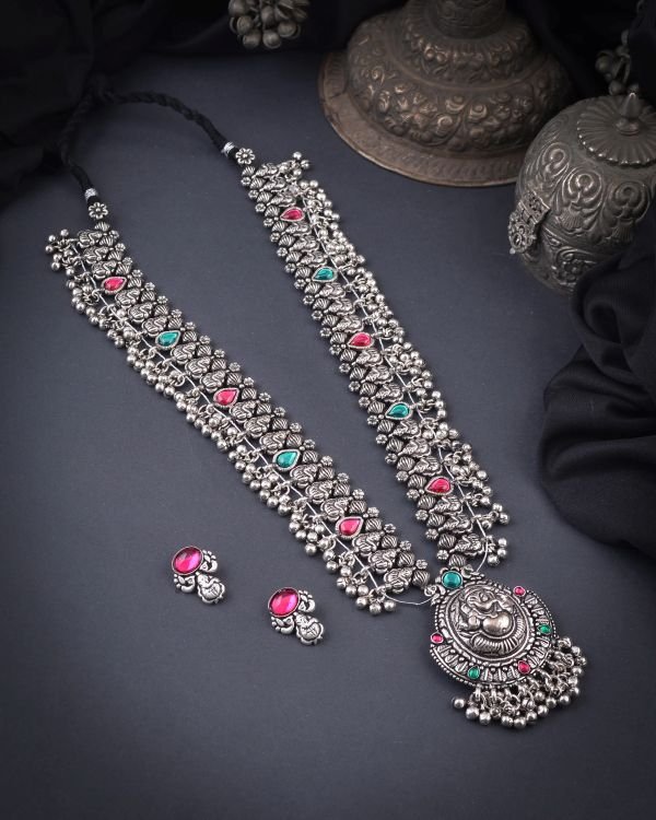 TheĀ The Oxidized Saaz is a traditional and stunning piece of jewellery that originates from the South Saaz is usually crafted with intricate patterns, including elements of traditional motifs like paisleys, floral designs, and geometric shapes. Sometimes, it can also feature religious or cultural symbols, such as peacocks or gods and goddesses, depending on the craftsmanship.